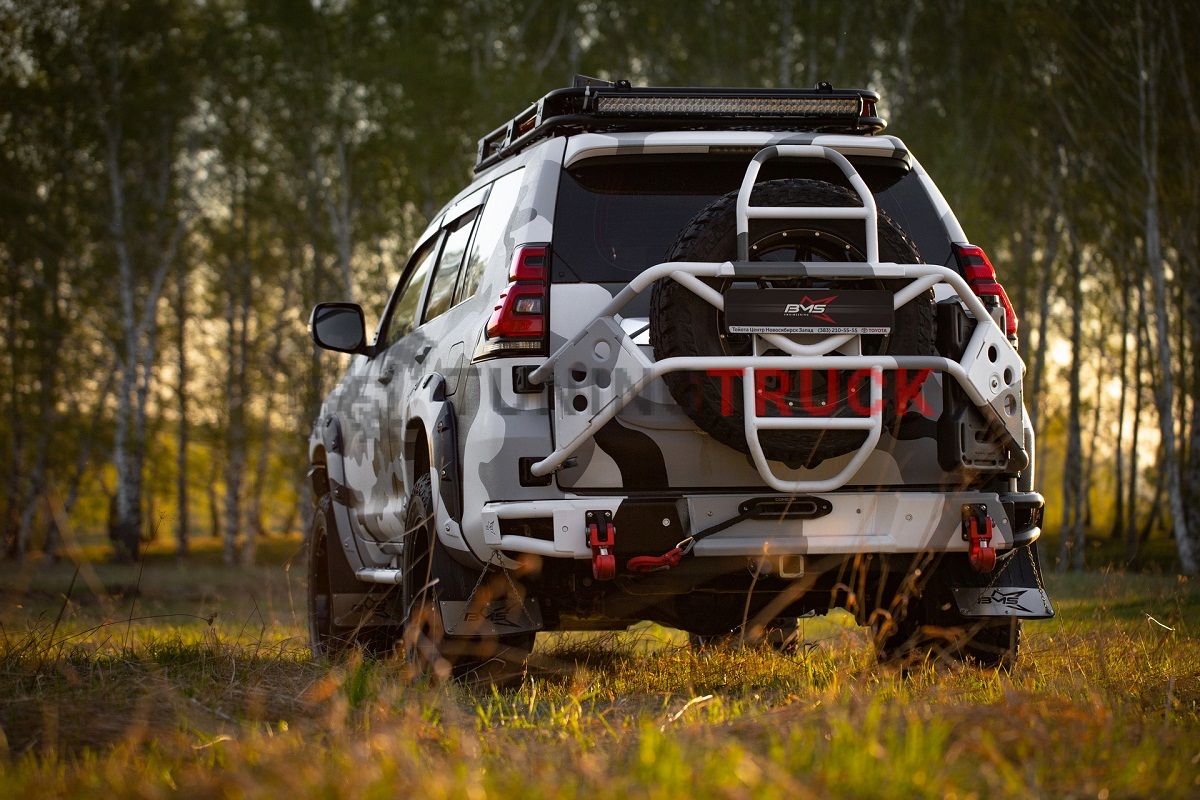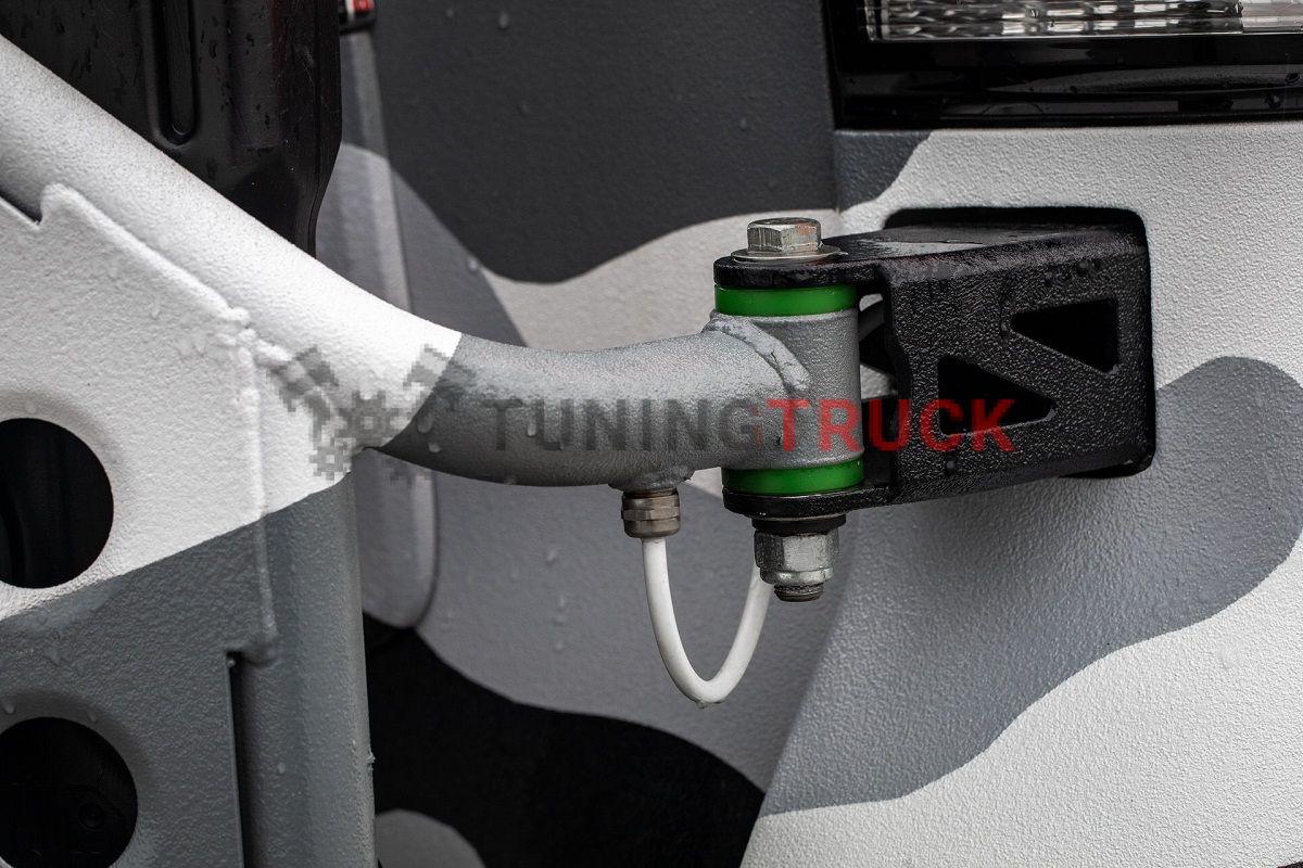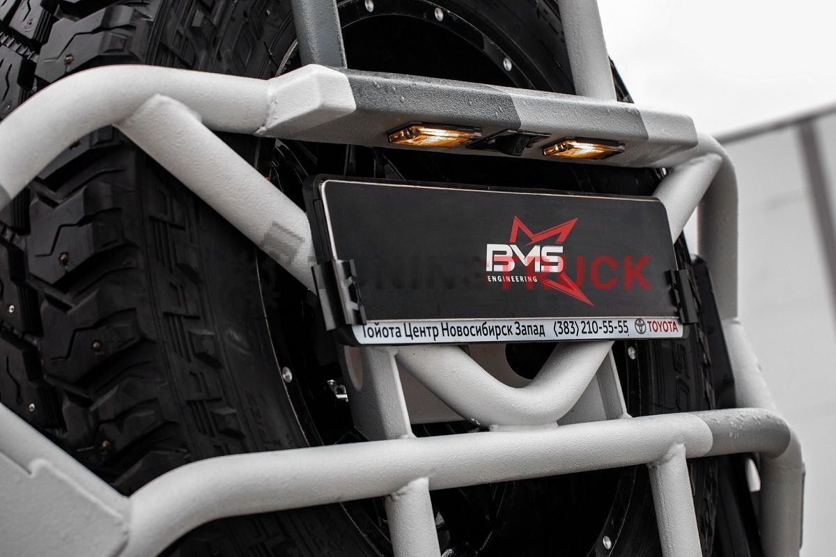 Калитка крепится напрямую к раме автомобиля. Это - полноценный силовой элемент, который способен удержать колесо размерами до 35 х 12,5”, а также гарантирует легкий доступ к нему, а также дополнительно защищает автомобиль от ударов сзади.