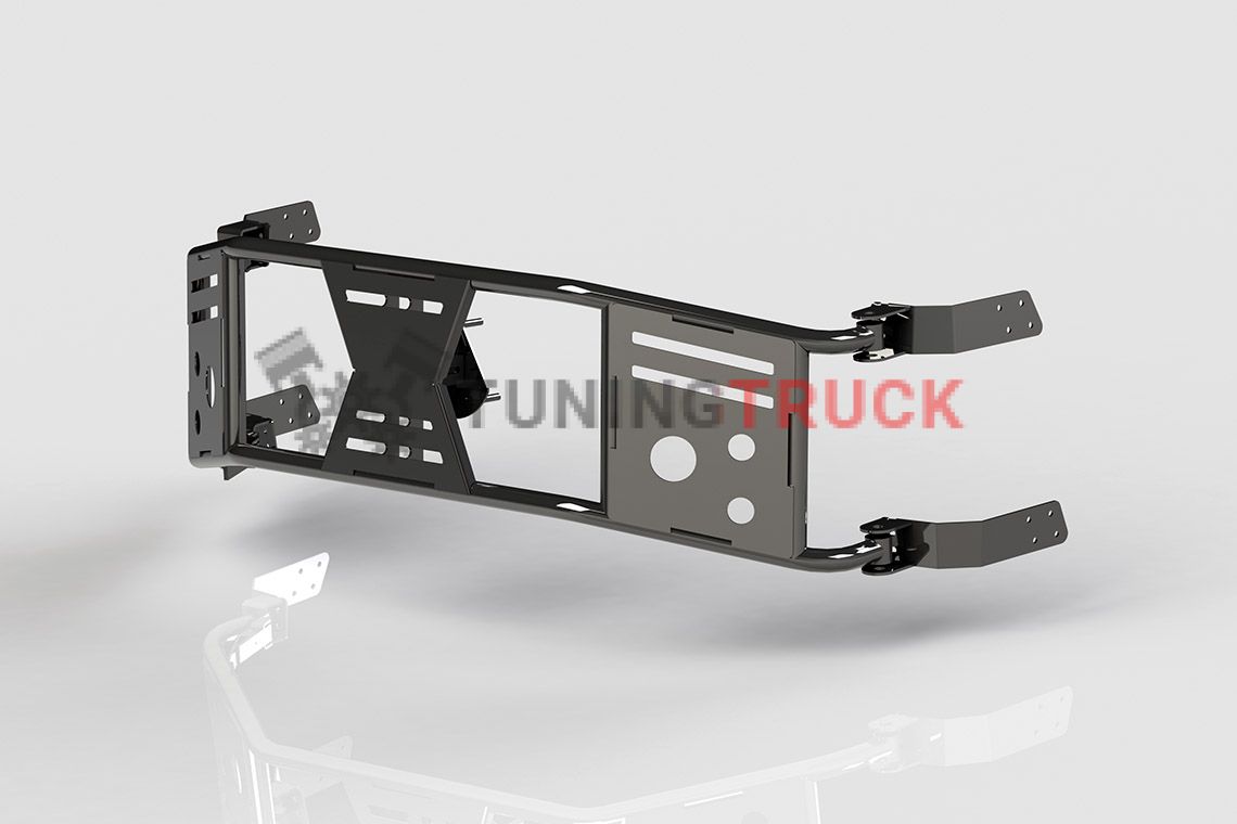 Крепится к кузову по 4-м точкам с помощью сайлентблоков и закладных элементов. Такая конструкция хорошо гасит вибрацию и убирает нагрузку с кузова, даже если запасное колесо имеет большой вес.