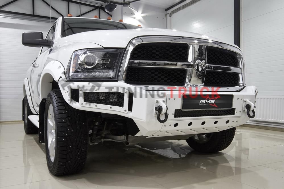 Передний силовой бампер для Додж Рам выполнен в лучших традициях американской школы внедорожного тюнинга. Каркас выполнен из стальной оцинкованной трубы с покрытием Raptor. Бампер делает экстерьер автомобиля более агрессивным и защищенным. Такое решение делает бампер более легким, чем аналоги из листовой стали.