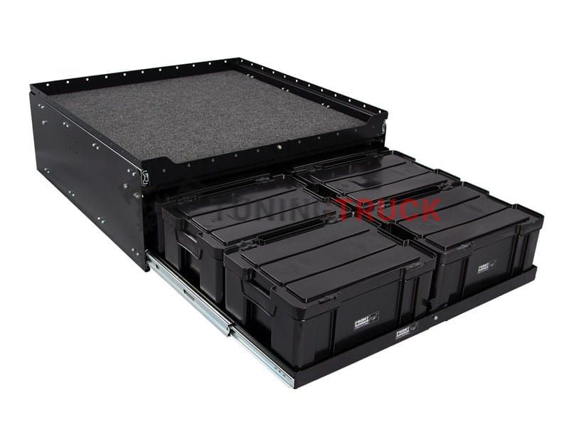 Выдвижная система на 6 ящиков с выдвижным верхом - комплексное и очень практичное решение для хранения и транспортировки грузов. Не затрудняет доступ к другим узлам, а раздвижной верх позволяет легко попадать в труднодоступные места багажника или грузовой платформы. Конструкция была разработана для использования в жестких условиях бездорожья или на обычных дорогах.