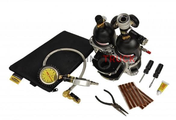 SIDEARM W BRACKET - DOUBLE BARREL, (NO HOSE) (2) 20 oz. bottle with on/off valve, Sidearm 160 Regulator, TIG-8200 w/ no elbow, blk. zipper bag, (2) dust caps, (4) 323 o-rings, Mini tire plug kit (10 plugs), SB-01 brkt (NO hose clamps), ABC Clamps.
