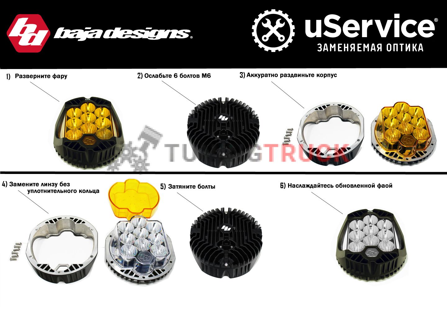 В рамках технологии uService® от Baja Designs вы легко можете заменить вышедшую из строя линзу или поменять внешний вид ваших светодиодных фар. Монтаж не займет много времени и труда. Инструкция в приложении.