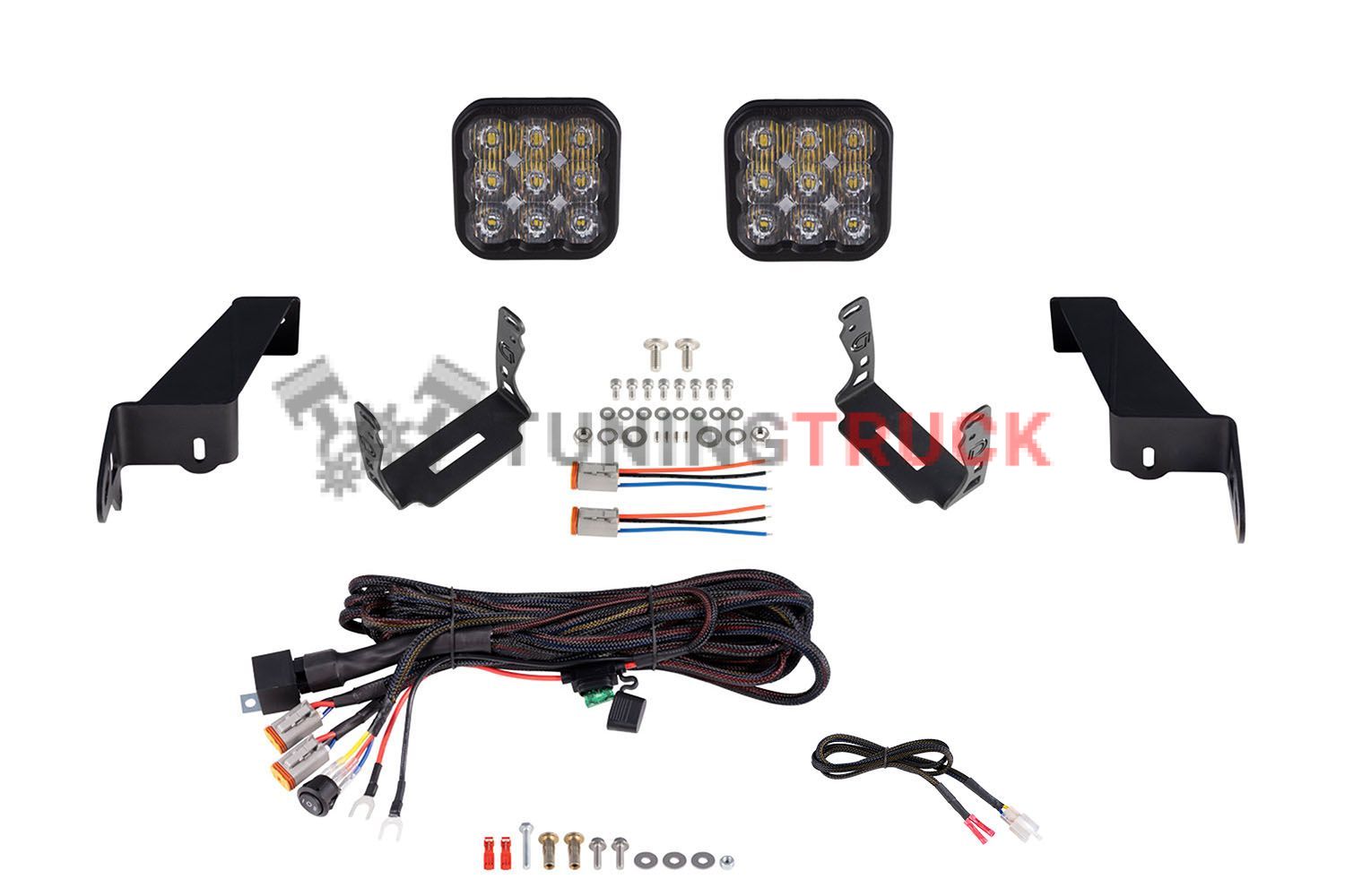 Комплект, в который входят светодиодная балка на 2 LED-модуля SS5 Pro от Diode Dynamics и набор кронштейнов для установки на передний бампер Jeep Wrangler 2018+. TIR-оптика, белые светодиоды. Кронштейны легко монтируются к заводским точкам крепления.