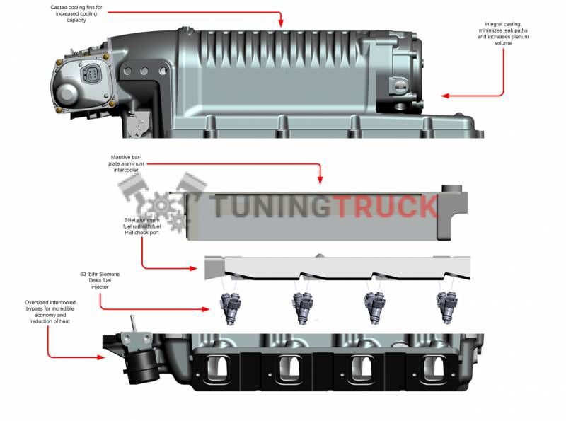 - Интегрированный дизайн позволяет использовать негабаритный интеркулер, что обеспечивает более низкую температуру подачи воздуха, что позволяет увеличить наддув и время работы насоса;