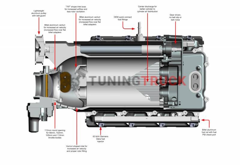 - Конструкция с верхним креплением обеспечивает более холодную работу, чем перевернутые SC, которые отводят тепло от двигателя и задерживаются направляющими кожухами, приводя к более высокой температуре коллектора и меньшей вырабатываемой мощности на фунт наддува;