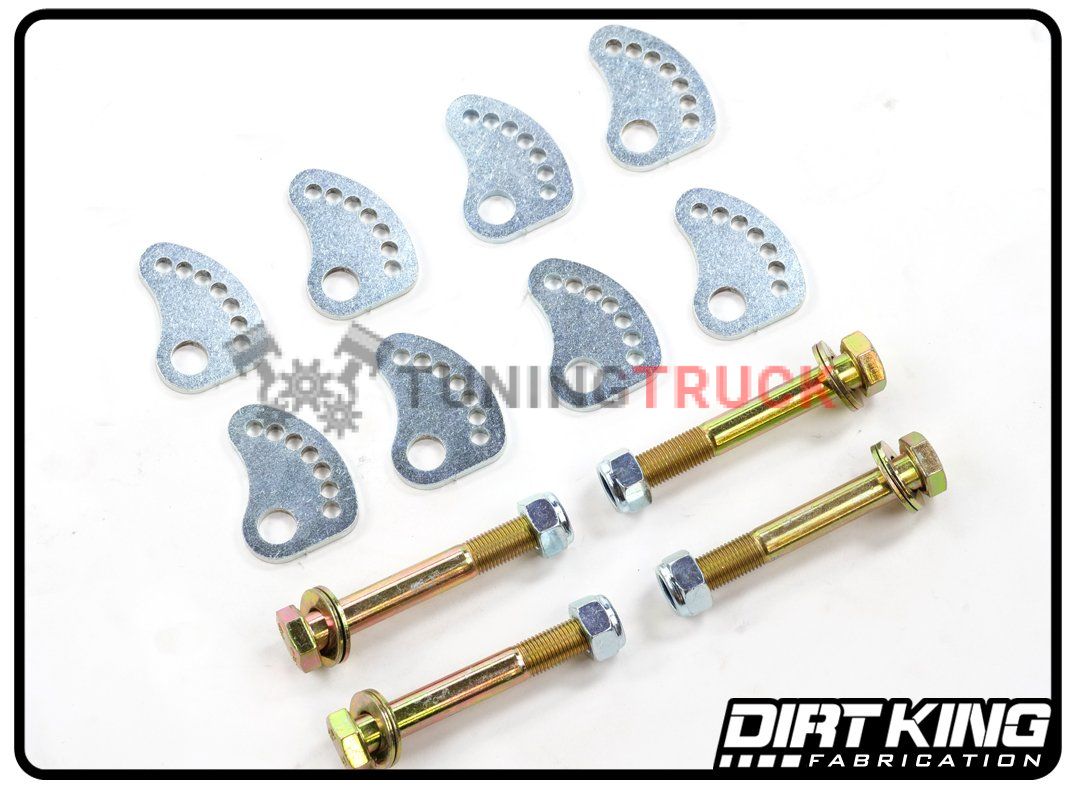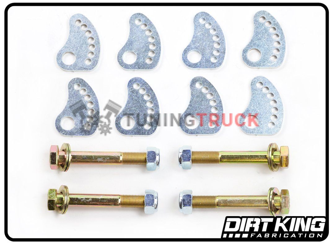 Развальные проставки и болты Dirt King для верхних рычагов являются самыми прочными на современном рынке. В комплект входят восемь центрирующих проставок, вырезанных лазером из стали толщиной 3/16 дюйма, и четыре болта. В каждой проставке вырезаны семь отверстий для максимально точного позиционирования верхнего рычага.