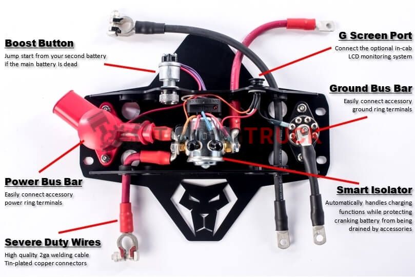 Любые аксессуары, подключенные к шинам питания и заземления, будут работать от дополнительной батареи. Заводской блок предохранителей по-прежнему будет питаться от основной пусковой батареи.