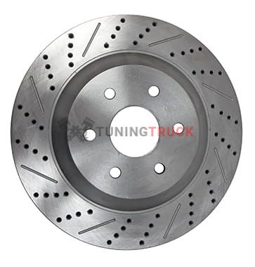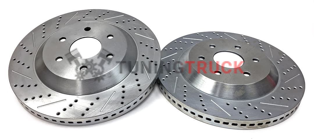 В комплекте тормозные диски перфорированные и слотированные диаметром 381мм