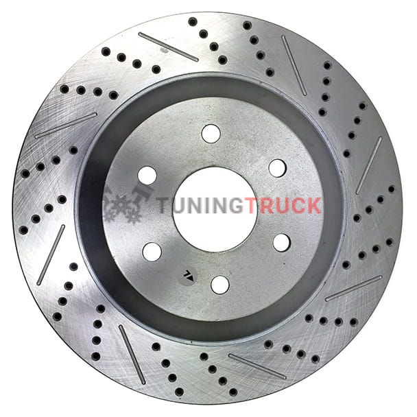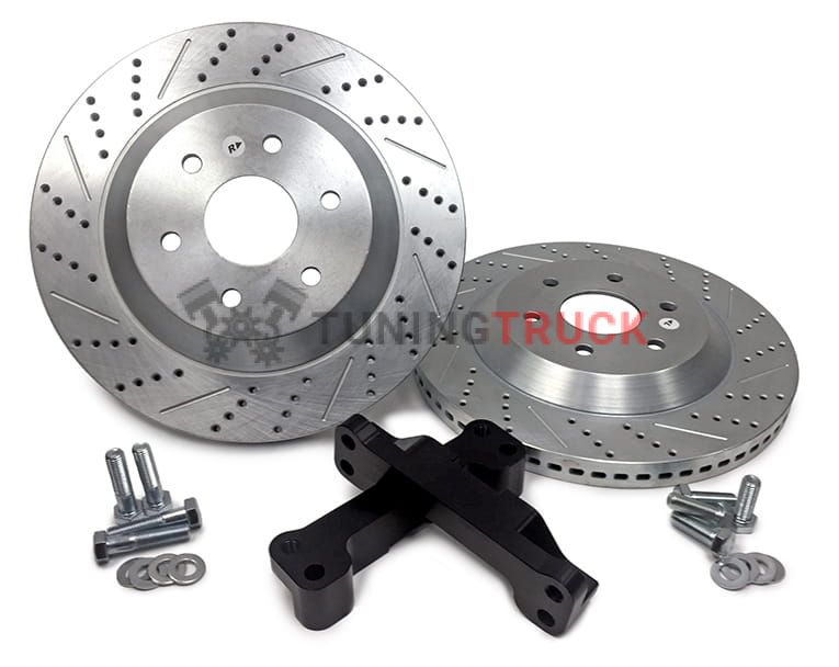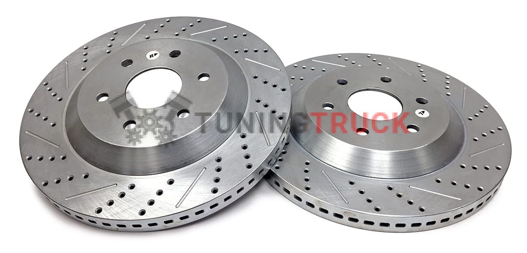 В комплекте тормозные диски перфорированные и слотированные диаметром 381мм